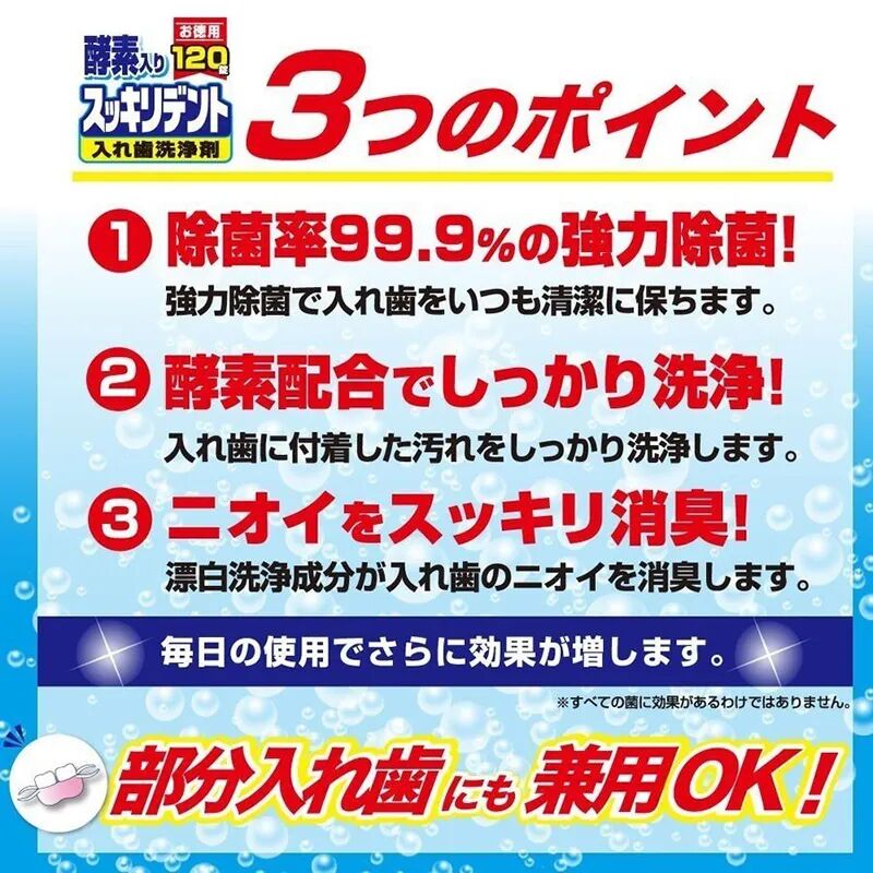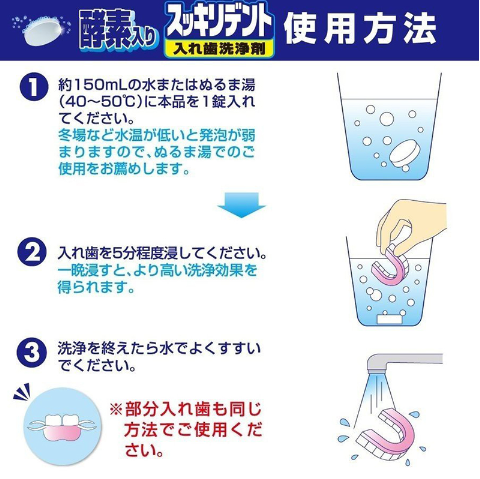 ●5分钟的愉快的短暂清洁时间。 只需将 1 片本产品加入约 150 毫升水或温水(40-50 度)中,然后浸泡假牙即可。 浸泡过夜以获得更好的清洁效果。 清洁后,用水彻底冲洗。