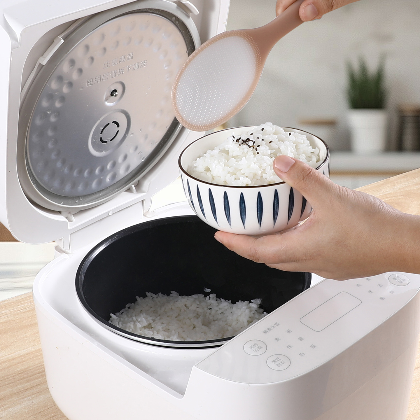 无需将饭勺留在电饭煲中或放入盛有水的容器中。