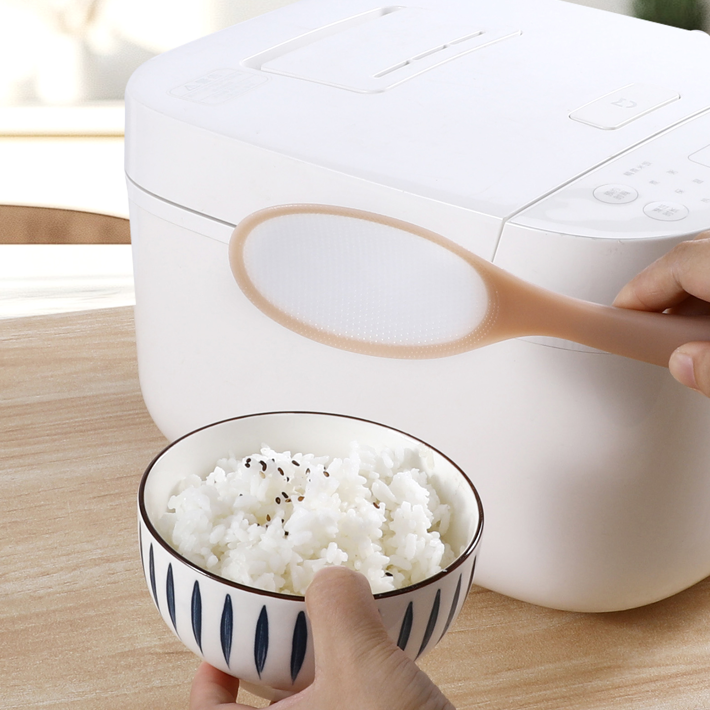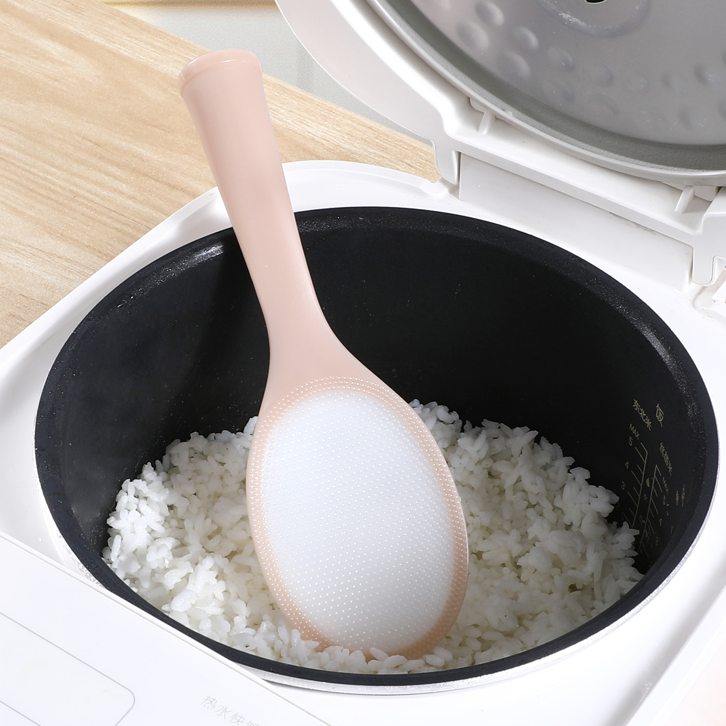 勺面设计超薄,防止压碎刚煮好的米饭。