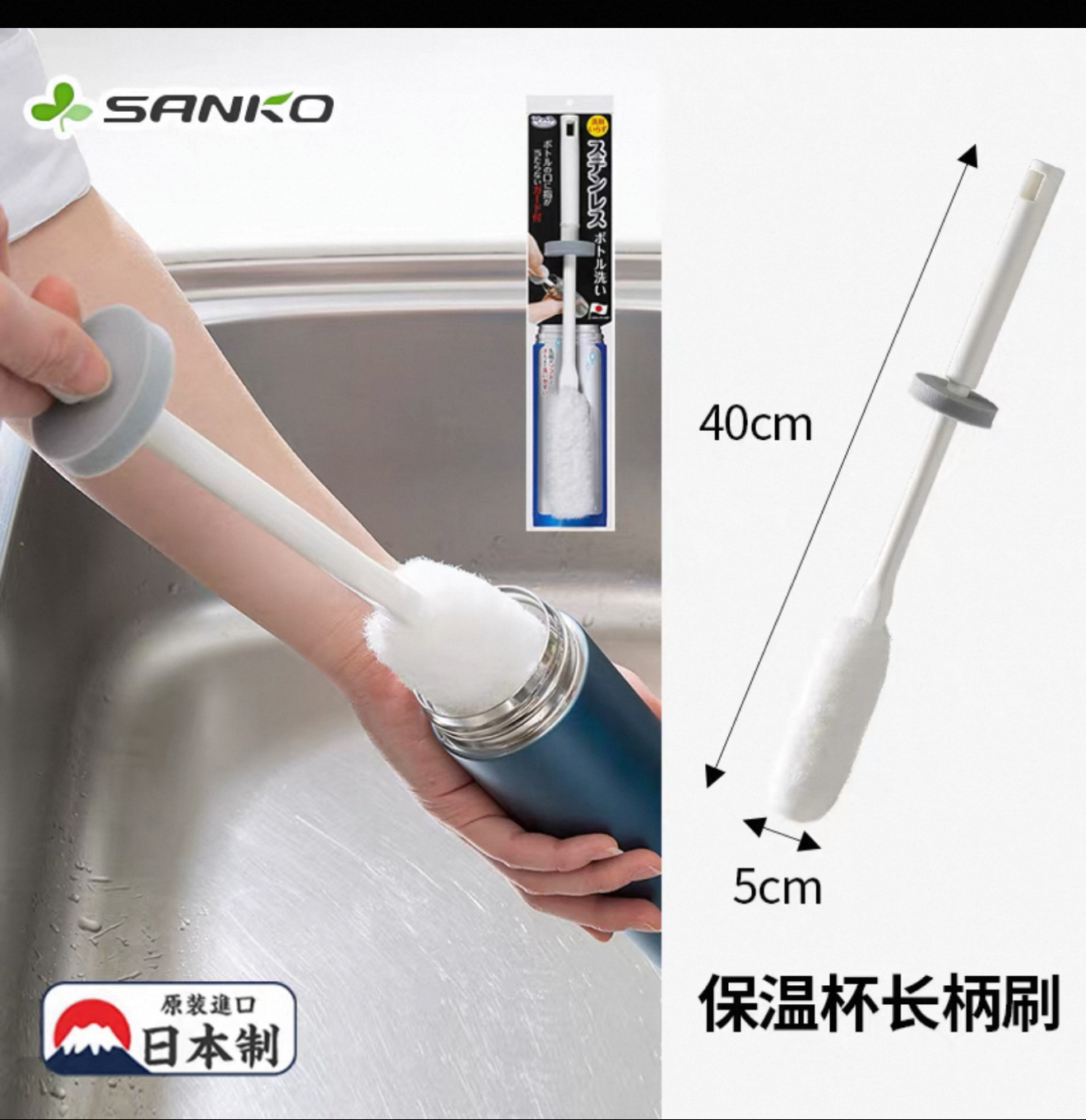 SANKO日本细口瓶刷洗杯子专用长柄(长柄圆头杯刷)灰色抗菌款