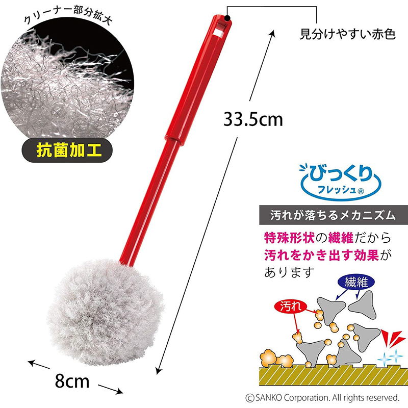 【清洁刷头】柔软的纤维360度覆盖,轻松清洁马桶边缘底部和积水深处,且不会溅水。