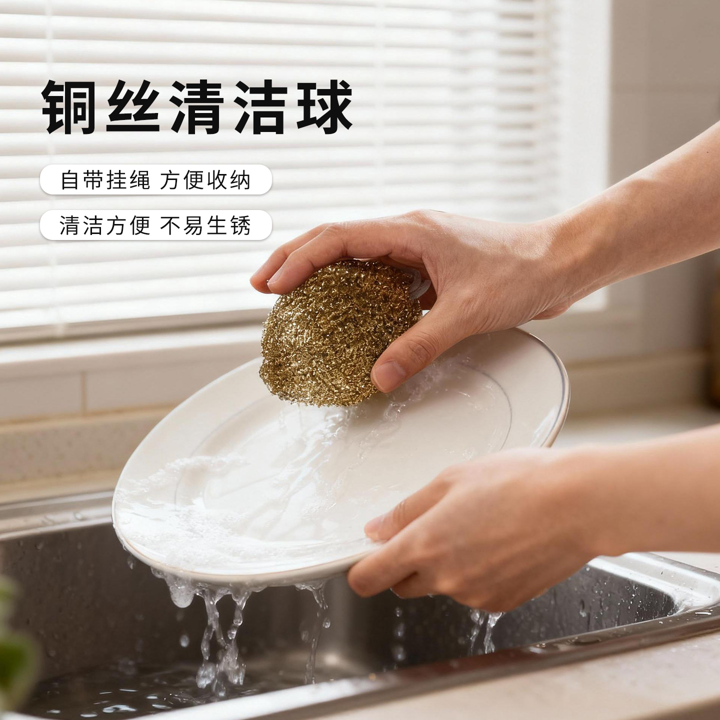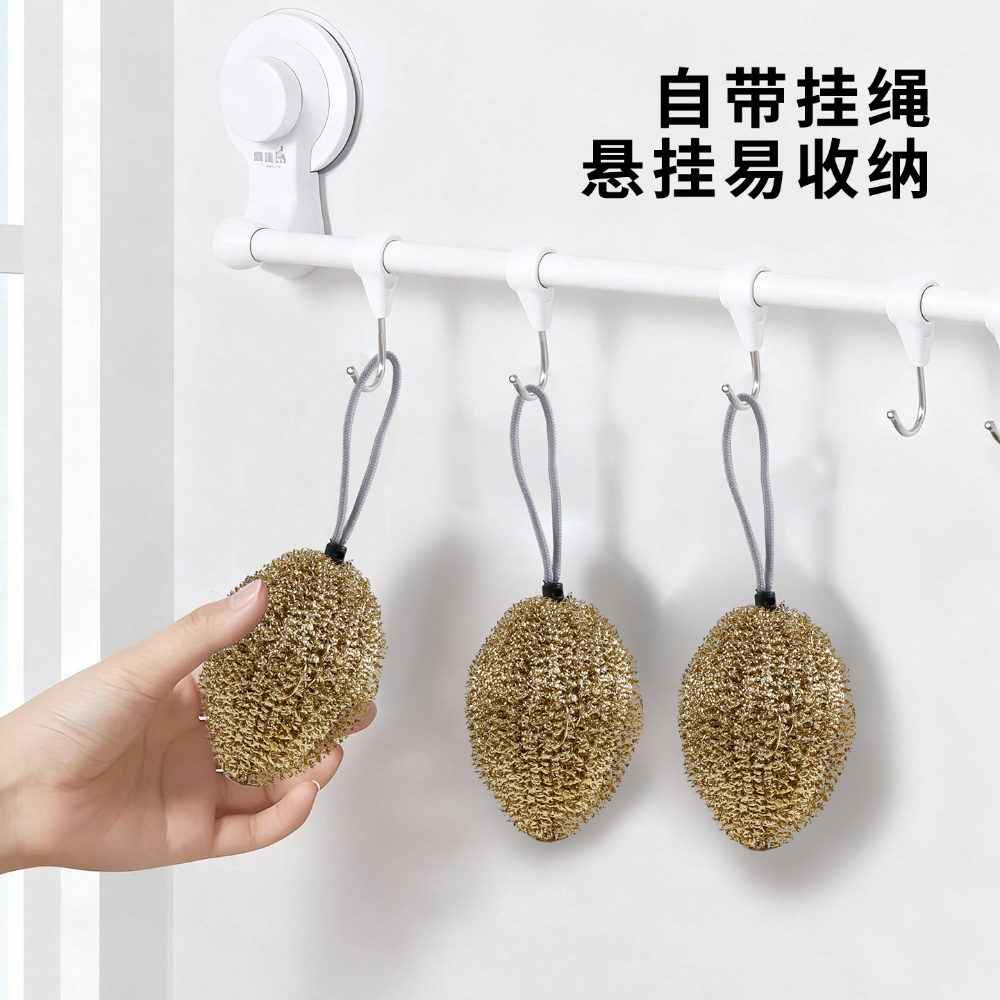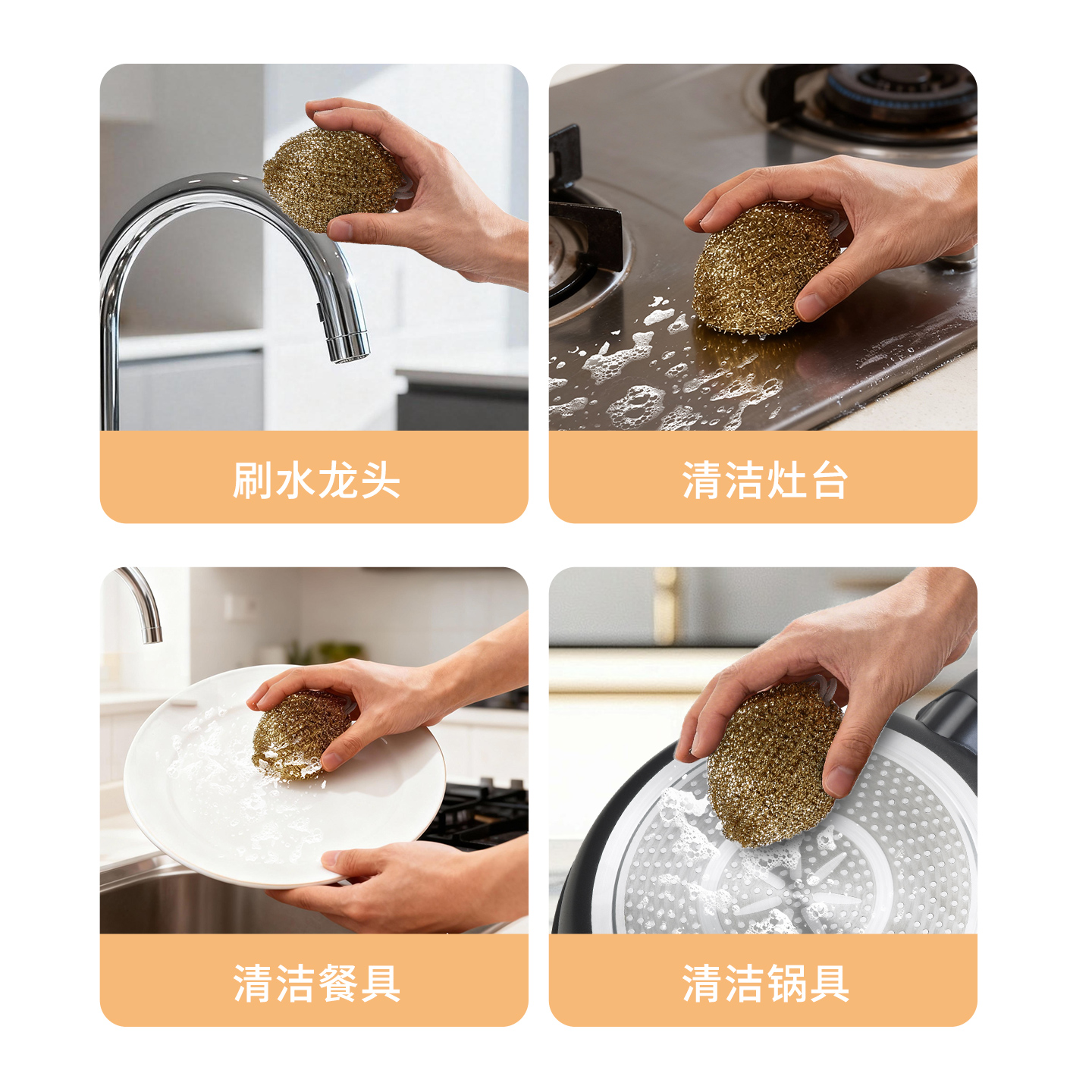 黄铜清洁球材质好不易锈、去污强还不伤器具,少掉渣更卫生,颜值高且用途广,耐用又实用。