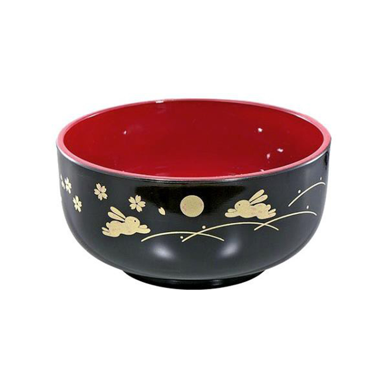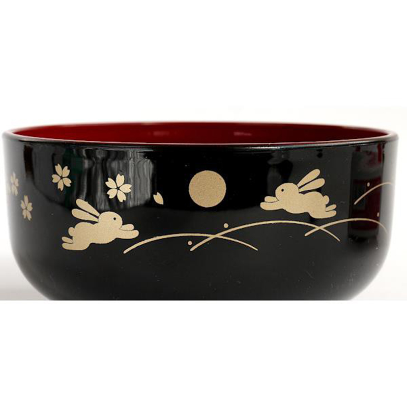这是一款中号碗。这款碗以亮黑色为底,饰有金色兔子图案。