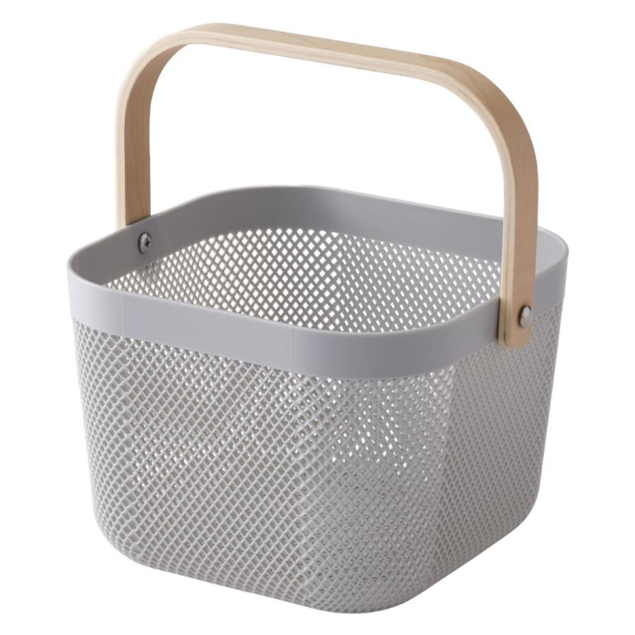 这款方形收纳篮采用天然木材制成,配有提手,方便携带。篮身采用塑料材质,防水防潮。