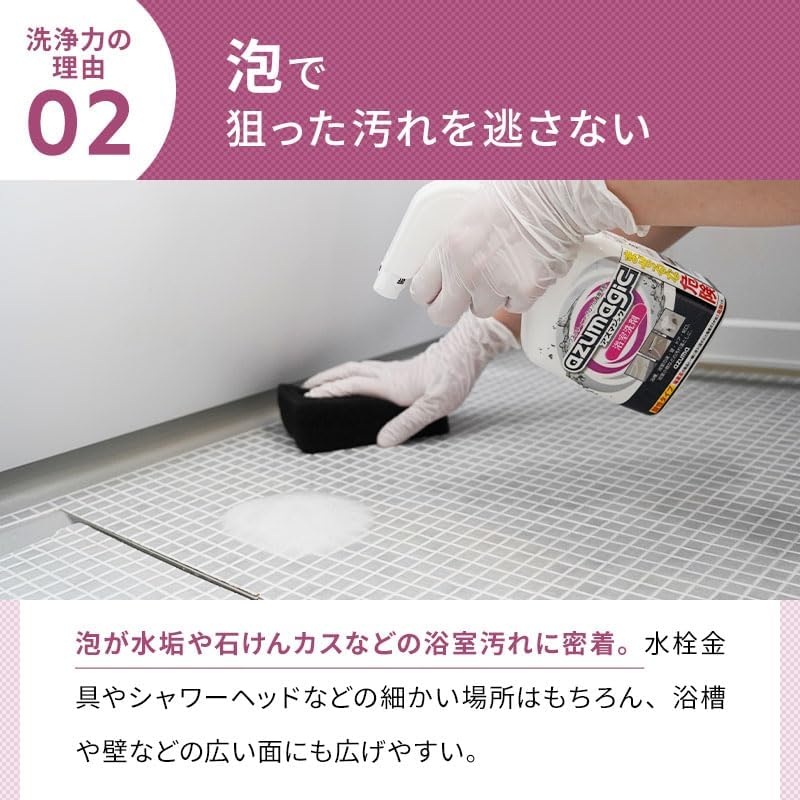 只需轻轻喷洒,这款浴室清洁剂即可强力分解并轻松去除浴室各处的白色顽固污垢和油脂污渍。适用于清洁浴缸、浴室地板、墙壁、门、水龙头和浴室配件上的污渍。